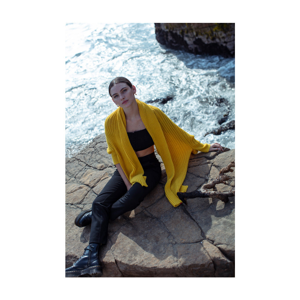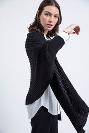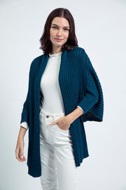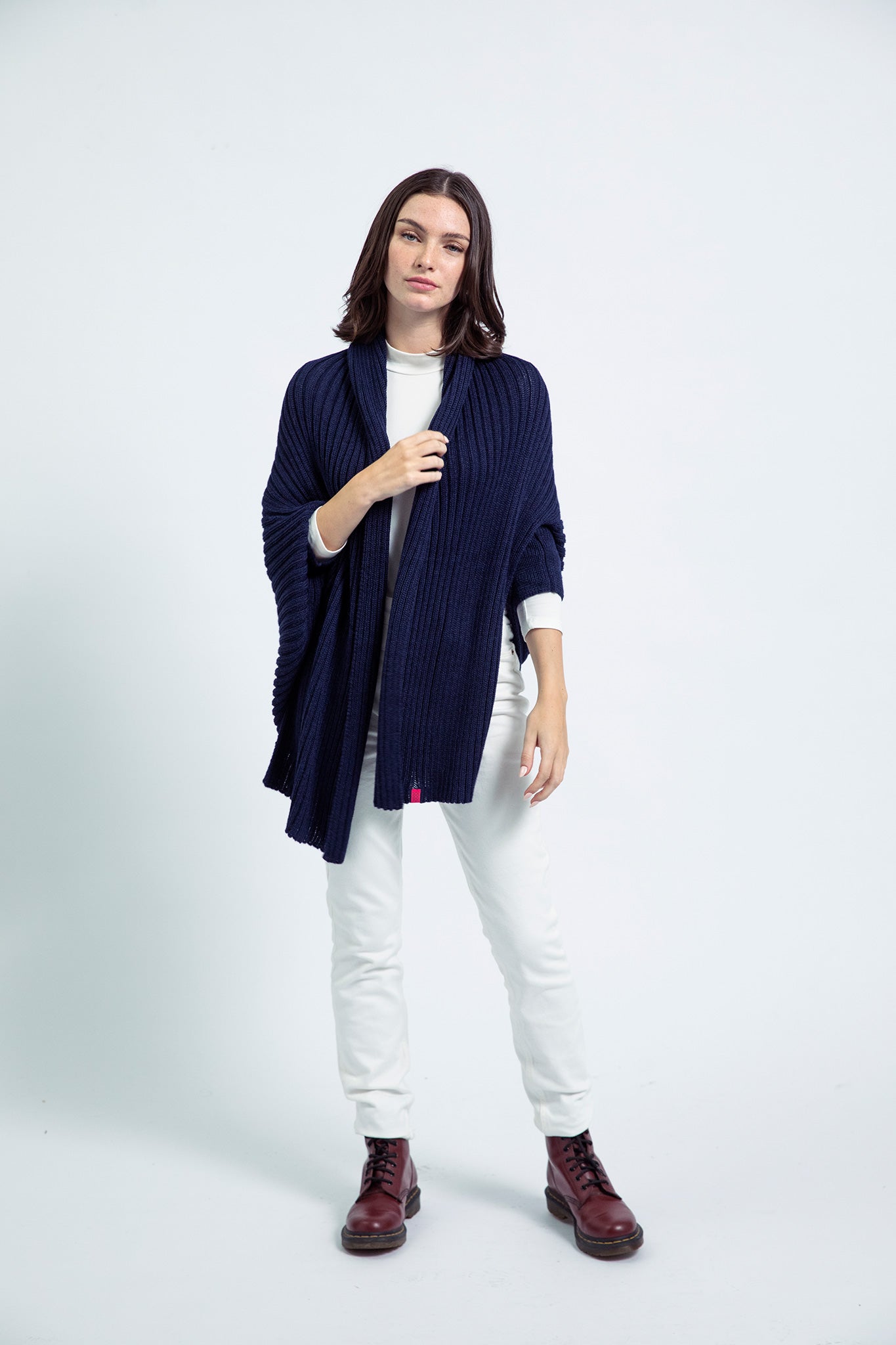 Une cape avec un style de cardigan tricoté en côte à porter de façon courte ou longue simplement en la retournant