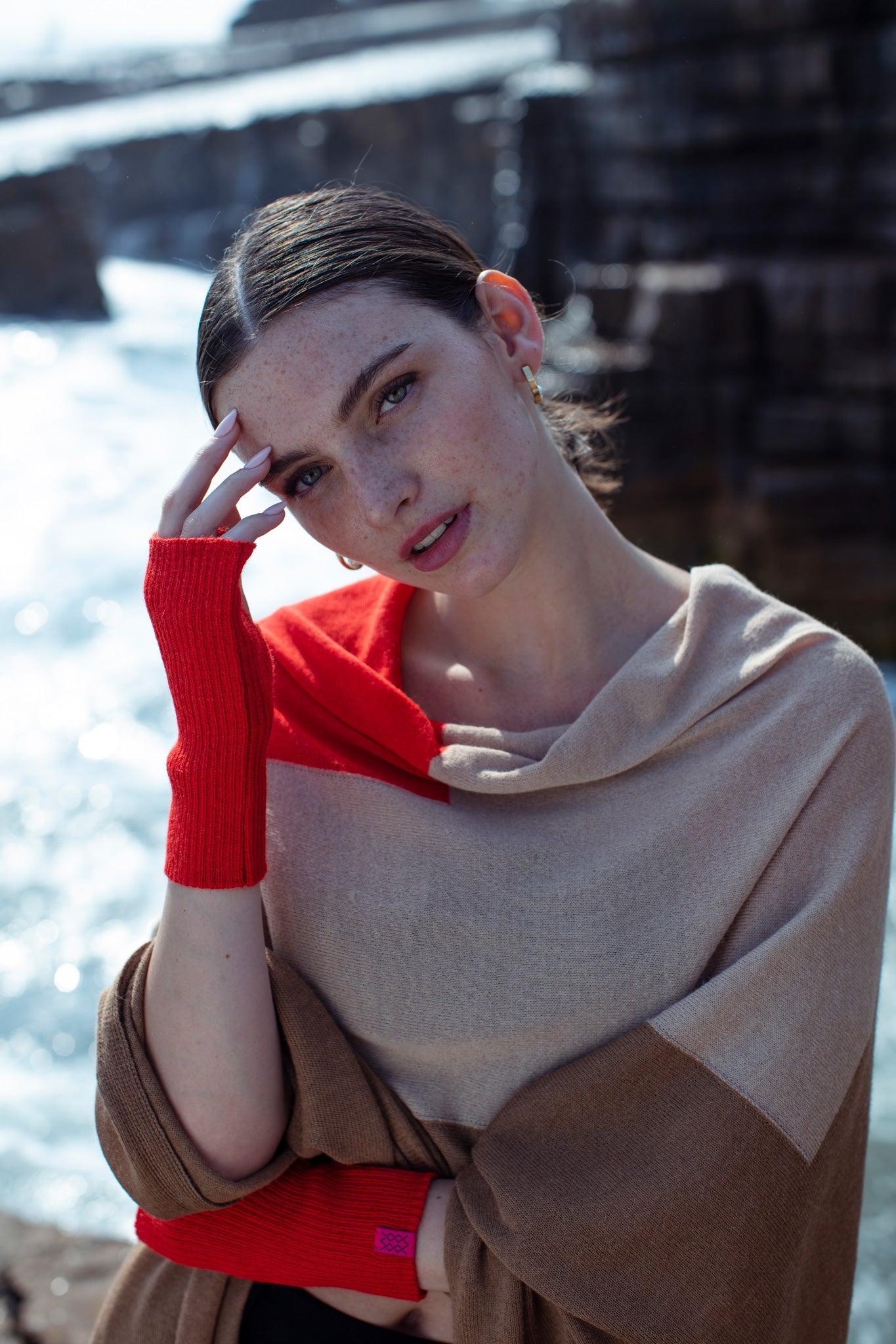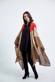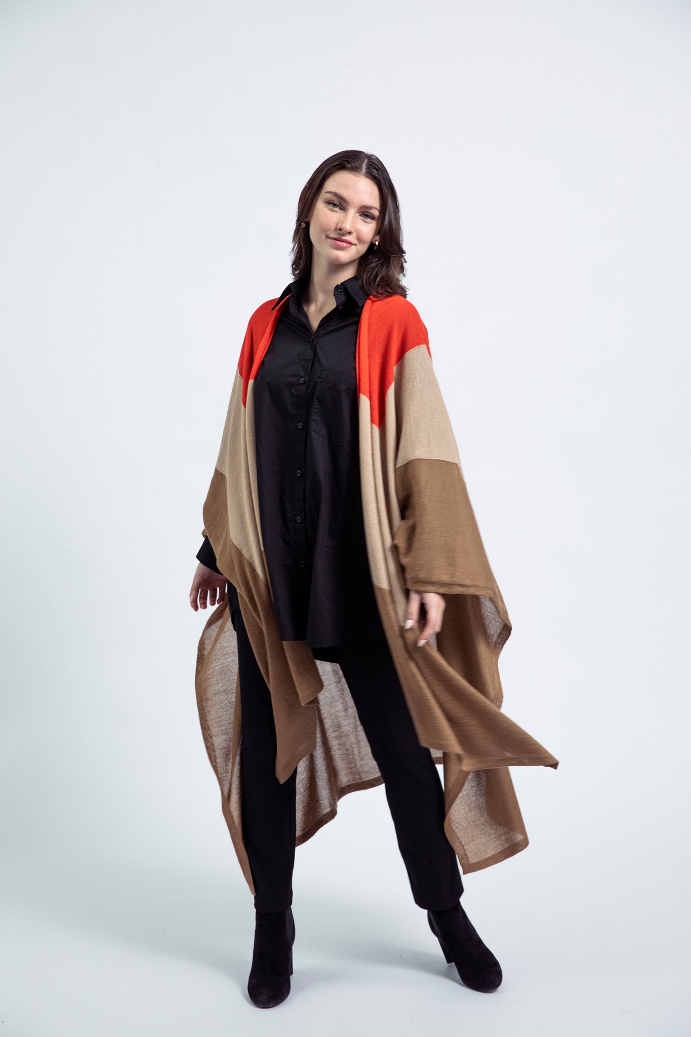 Elégance et fluidité avec cette longue cape tricolore que vous pouvez aussi utiliser comme un châle remonté sur les épaules.